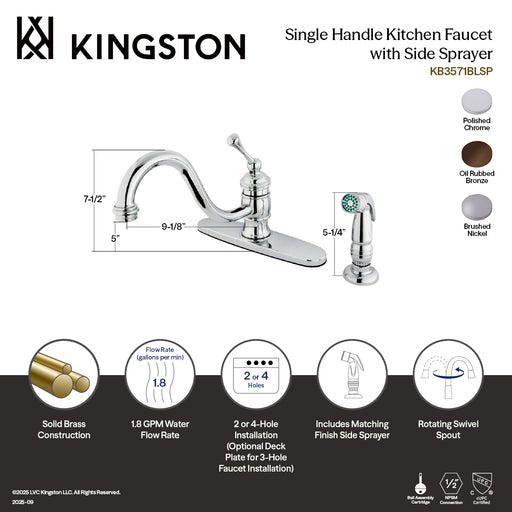 Kingston KB3571BLSP Single-Handle Kitchen Faucet with Side Sprayer, Polished Chrome The exquisite design of this faucet tastefully flatters the ...
