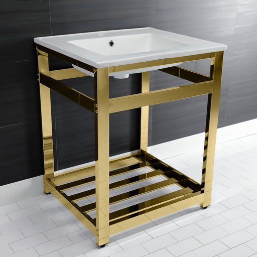 Kingston Brass VWP2522A2 Quadras 25" Ceramic Console Sink with Steel Base and Shelf (1-Hole), White/Polished Brass Exquisitely styled for your c...