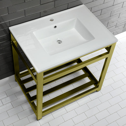 Kingston BrassKingston Brass VWP3122A7 Quadras 31" Ceramic Console Sink with Steel Base and Shelf (1-Hole), White/Brushed Brass Exquisitely styled for your co...
