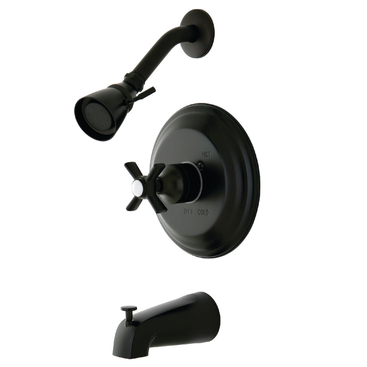 Integrating eclectic style in your home is easy with this tub and shower faucet's classical design. Complete with an easy-to-turn cross handle, an optimum bathing experience awaits. Enjoy the sturdy brass construction and premium oil rubbed bronze finish for a fixture that will last for years to come. A pressure balanced valve is included for safety and protection against accidental burns.